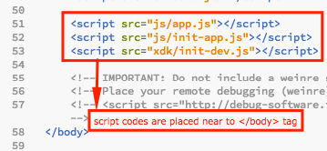 We also import a number of important scripts that make the app works, such as Cordova and Intel XDK, and app.js.